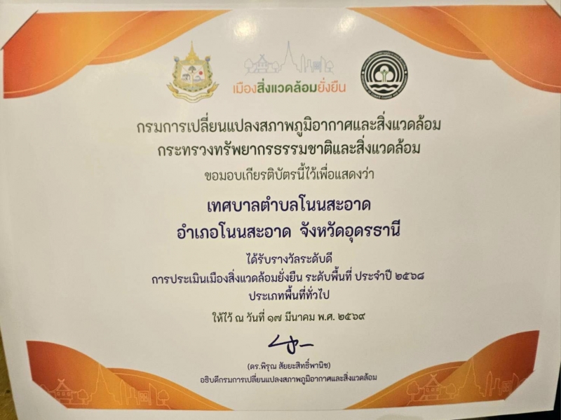 ซึ่ง เทศบาลตำบลโนนสะอาดได้รับรางวัล " ระดับดี "