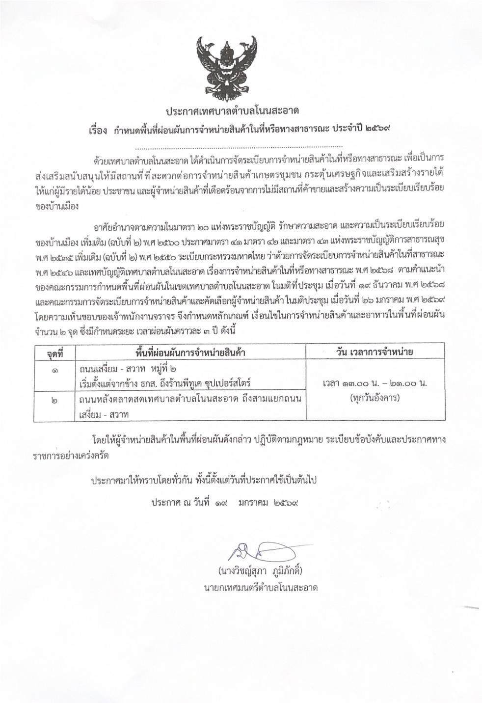 ประกาศเทศบาลตำบลโนนสะอาด เรื่อง กำหนดพื้นที่ผ่อนผันการจำหน่ายสินค้าในที่หรือทางสาธารณะ ประจำปี พ.ศ.2569 |